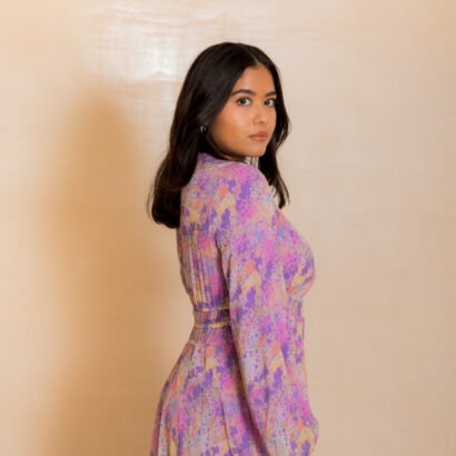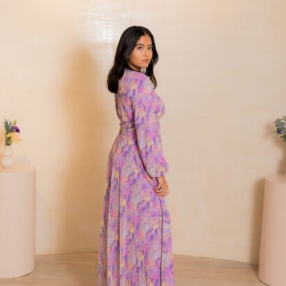 Purple Longsleeve, floor-length printed chiffon Dress with colorful paint design and elasticated waist detail.