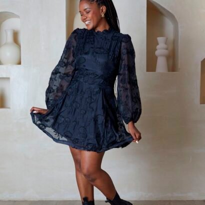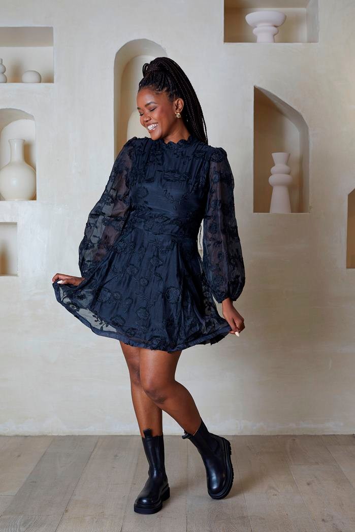 Black long sleeve , above the knee sheer taffeta dress with embossed flower detail and neck detailed pattern.